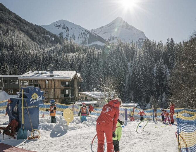 Unsere eigene Kinderschischule sorgt dafür, dass die Kleinen spielerisch die Pisten erobern, während die Eltern die herrlichen Abfahrten genießen können.
