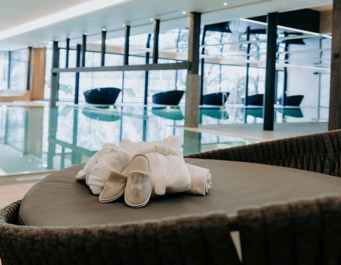 - Großzügig erweiterter Indoor Pool mit bequemen Relaxinseln und -Kojen, Zwergenpool, Whirlpool (35°C), Riesen-Reifenrutsche