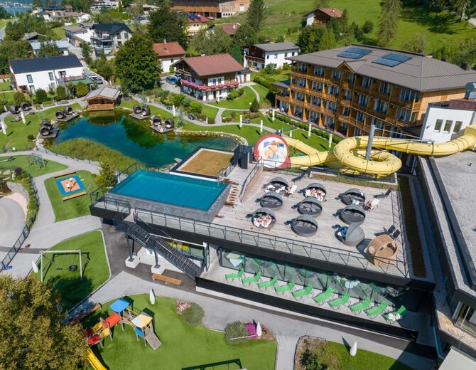 - Großzügig erweiterter Indoor Pool mit bequemen Relaxinseln und -Kojen, Zwergenpool, Whirlpool (35°C), Riesen-Reifenrutsche